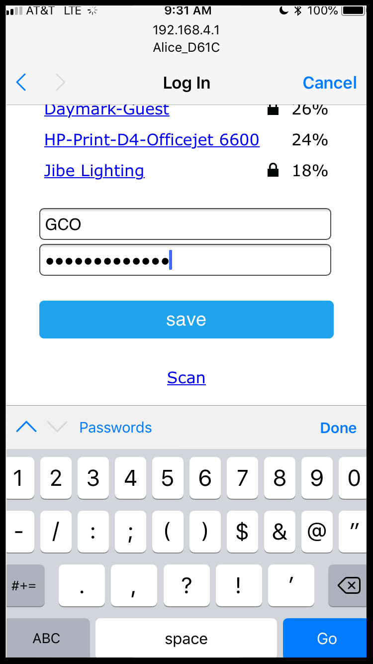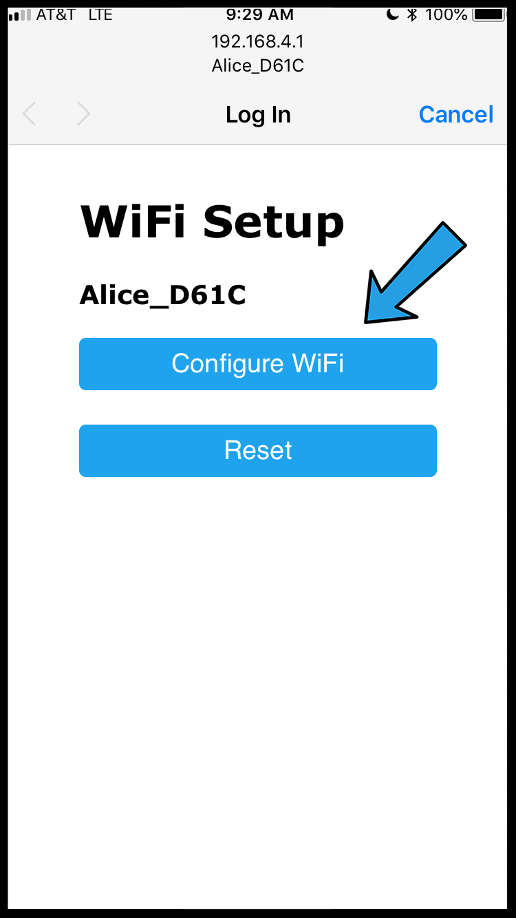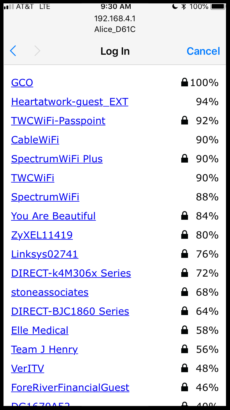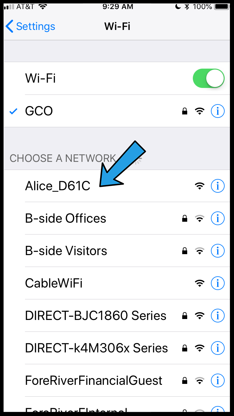 Now, go into Settings on your mobile device, then into Wi-Fi. You should get a screen that looks like this (on an iPhone) showing networks in your area. Click on the network named Alice_XXXX. The last 4 characters will be the same as your device ID.