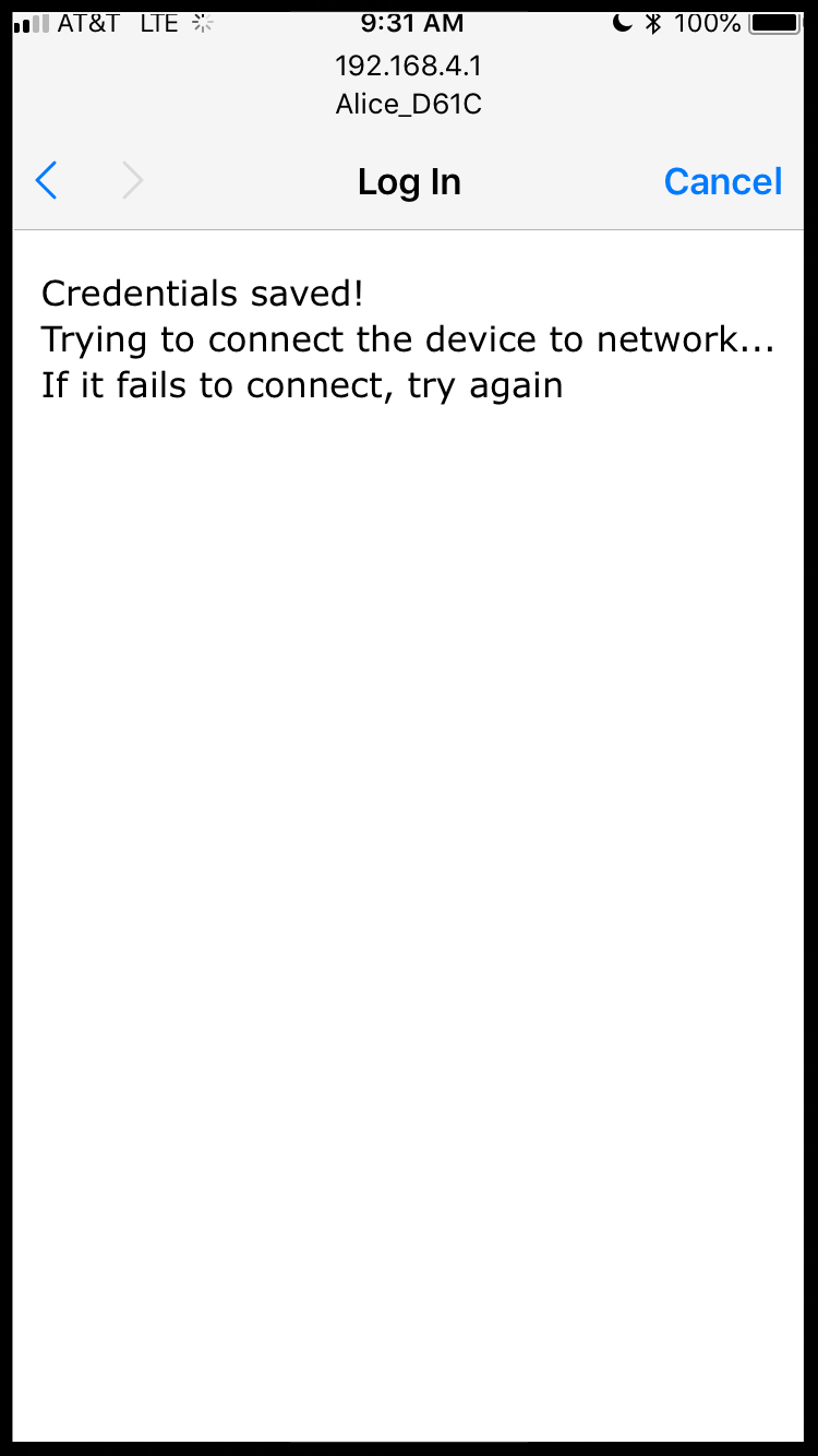 You should now see a “Credentials saved!” success message on your screen. Once the gauge has connected to wi-fi and has checked that it has the latest firmware version on it, the light will stop blinking and you can proceed to downloading the Alice app and setting up your account from there.
